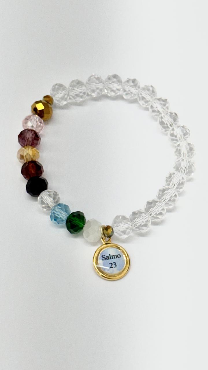 Pulseira Salmo 23 Cristal fio de silicone - 18 Cristais 8mm Transparente - 10 Cristais 8mm Variados - 02 Cristais 4mm Irizados - 01 Medalha salmo 23 Resinada - 01 40 cm de fio de Silicone - 01 Cartão Salmo 23